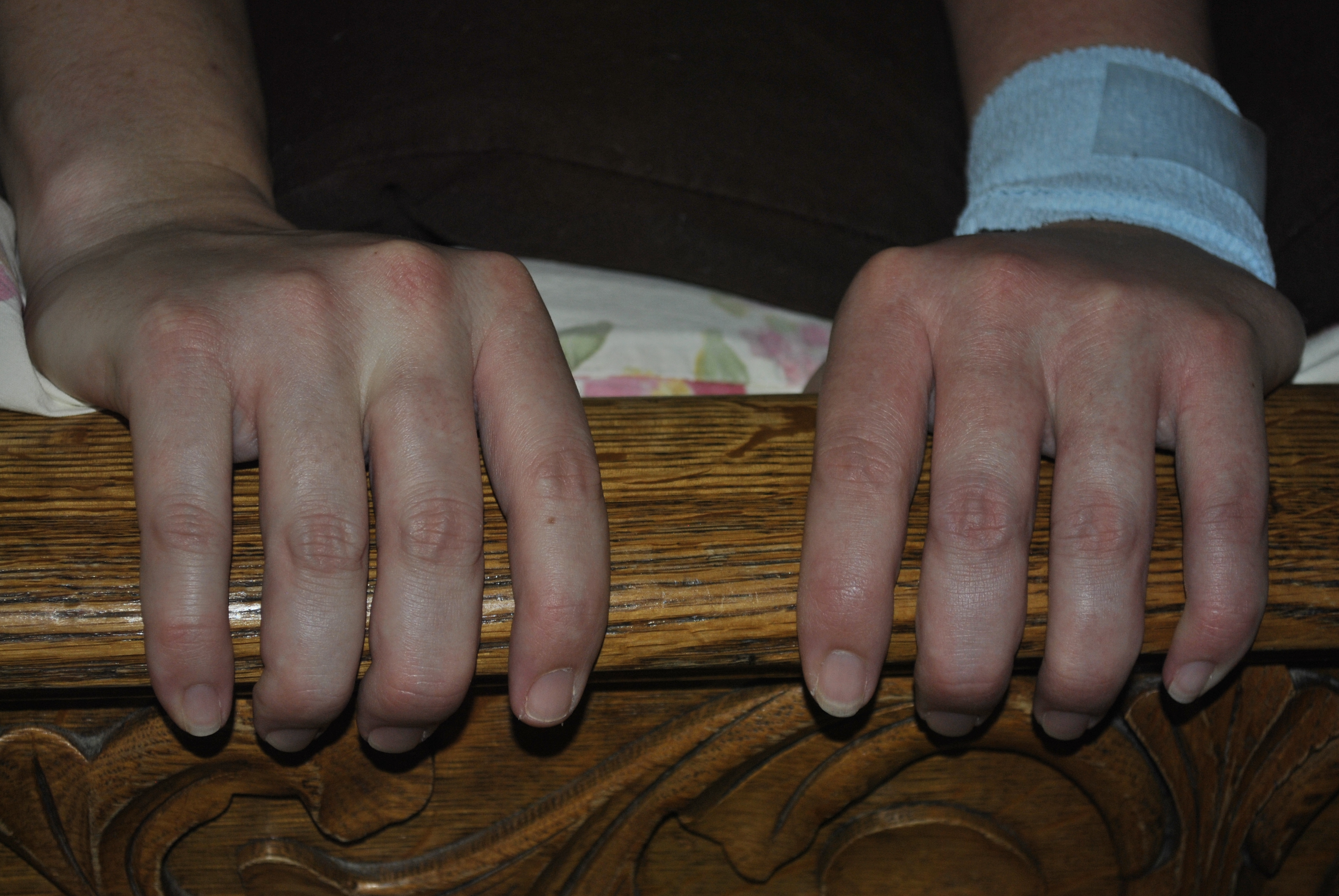 hands gripping footboard of bed