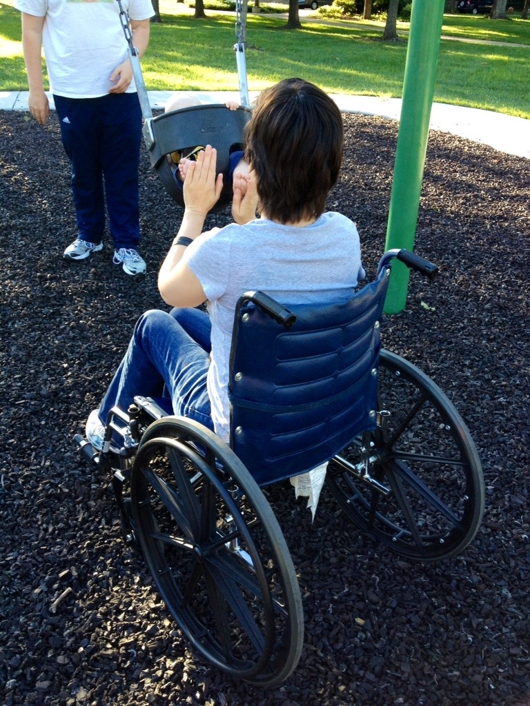 I saw the joy in her eyes yesterday as she watched her 7-month-old son go for his very first ride in a playground swing. She was able to maneuver her wheelchair right up to the swing, which wasn’t easy, considering the playground “turf” appeared to be made of recycled tires.