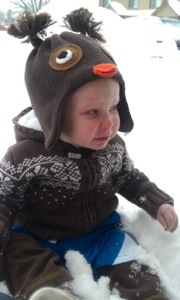 Not what I had imagined. After less than 10 minutes I carried my devastated little boy – who turned 13-months old that day – back into the house. We snuggled until he was relaxed again. Then he was off to play and had a terrific day. I decided we would try again, reminding myself that obviously this first experience doesn’t determine whether he will ultimately enjoy the snow. Friday turned out to be a snow day, too. My husband and I took him out and he did a little better – just a little. Maybe next year will be more fun. And make more sense to him.